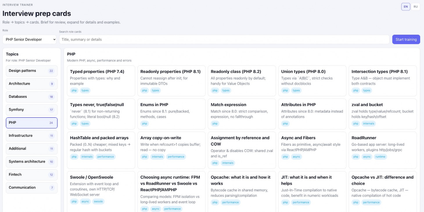 Во-вторых: в рамках подготовки к собесам я готовился по собранным собственноручно справочным материалам конкретно по моей специализации - Senior PHP Developer (Symfony). Всю собранную информацию я оформил в виде интерактивной странички, где по категориям выстроены необходимые и спрашиваемые на эту позицию знания: от всем надоевшего SOLID и ООП до нюансов реализации PHP COP и lazy загрузки в Doctrine. Есть даже режим тренировки, но особо его не прорабатывал.